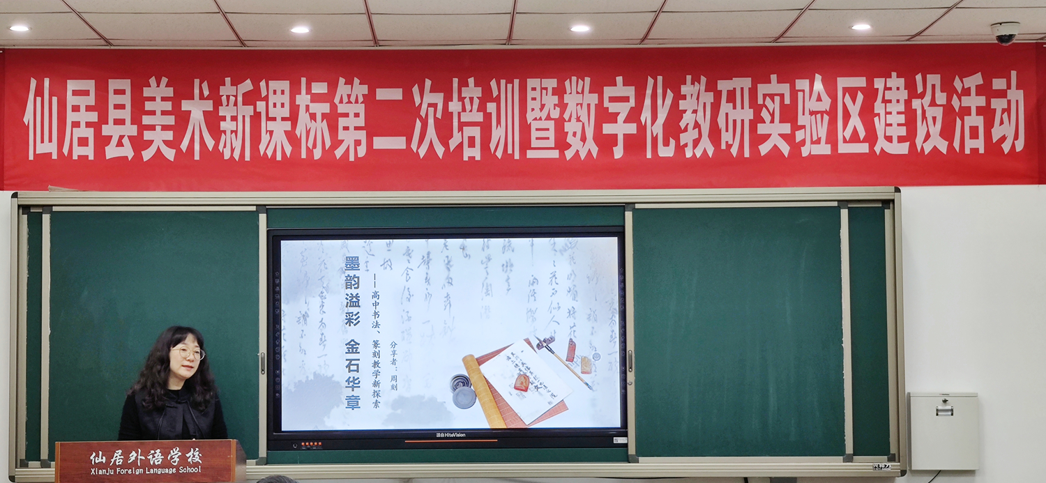 接下來是周刻老師為我們帶來《墨韻異彩,金石華章高中書法篆刻教學(xué)新探索》的講座。她是溫州市第二十二中學(xué)的美術(shù)老師,也是浙江省女書法家協(xié)會會員、溫州市女書法家協(xié)會副秘書長、溫州市篆刻創(chuàng)作委員會委員。在講座中她跟我們分享的書法篆刻教學(xué)實踐,讓我們明白精彩的書法篆刻課堂應(yīng)將實踐、鑒賞與理論結(jié)合。這是我們需要一直學(xué)習(xí)和探索的課程。
