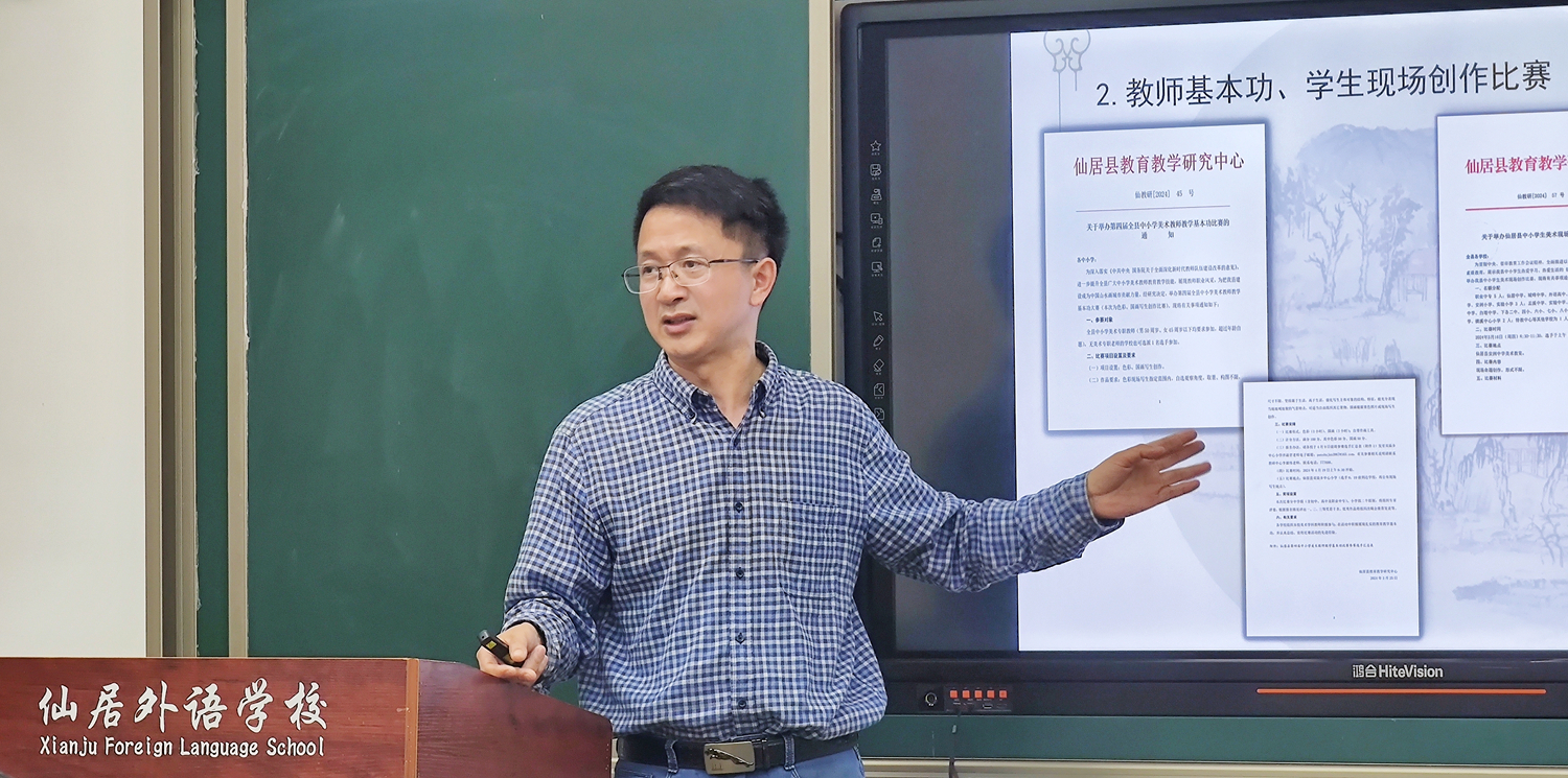 活動伊始,徐軍勇校長首先對各位領(lǐng)導(dǎo)和美術(shù)老師的到來表示熱烈歡迎!并介紹了學(xué)校的概況、辦學(xué)理念、發(fā)展愿景、育人目標(biāo)、教風(fēng)學(xué)風(fēng)等,指明了學(xué)校的特色與亮點。同時,根據(jù)外語學(xué)校的實際情況闡述了新課程理念教學(xué)實踐下提升學(xué)生的美育基本素養(yǎng),并深刻表達了基于中學(xué)教育美術(shù)一體化改革的所教、所見、所思,引發(fā)共鳴。最后,徐校長代表仙居外語學(xué)校向教育局的高度重視與大力支持表示感謝!
