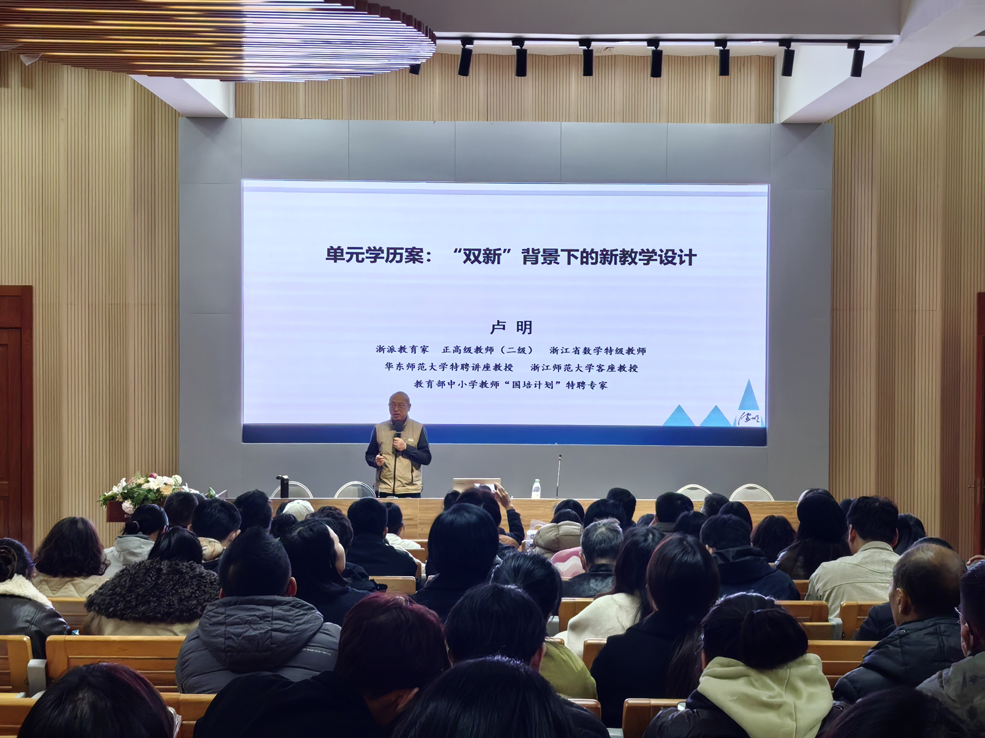 仙外校園網(wǎng)訊 為進(jìn)一步深化教育教學(xué)改革,推動“雙新”背景下的課堂轉(zhuǎn)型與教學(xué)設(shè)計(jì)創(chuàng)新,我校于11月26日特邀浙江省數(shù)學(xué)特級教師、正高級教師、教育部“國培計(jì)劃”特聘專家盧明教授,在仙居外語學(xué)校中學(xué)部階梯教室,為全體教師帶來了一場題為《“雙新”背景下的新教學(xué)設(shè)計(jì)——單元學(xué)歷案》的專題講座。